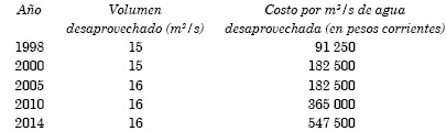 En 1998, se estimó que en los municipios mexiquenses se desaprovechaban 15 m3/s por fugas, lo que equivalía a mxn 91 250 por m3/s diarios que se quedaban en el subsuelo. A pesar de que en los años siguientes la cantidad desperdiciada aumentó marginalmente (6.6% de 1998 al último trimestre del 2014), el costo de recuperación se disparó a una tasa de 540%, tal como se aprecia en el Cuadro 6 (cfemym, 2014; Milenio, 2014).