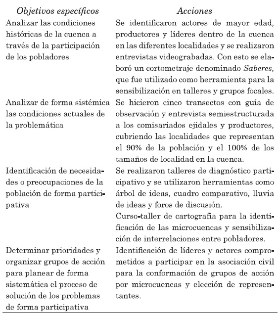 En cada una de las etapas señaladas se establecieron objetivos y se realizaron acciones para cumplirlos. En las Tablas 1, 2, 3 y 4 se muestran las etapas del proceso IAP, los objetivos y las actividades realizadas.