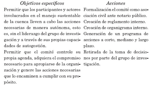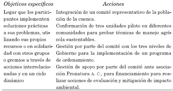 También, la asociación civil realiza diagnósticos de la condición ambiental, social y de la gestión con el apoyo y la asesoría del IPN y de algunas otras asociaciones civiles, como Pronatura Noreste A. C. Es decir, el comité de la cuenca es ahora un organismo de la sociedad que comienza a ganar reconocimiento y cuenta ya con la validación necesaria para proponer e integrar las distintas alternativas de gestión de los recursos naturales y preservación ambiental que realizan, por ahora de forma dispersa, los sectores comunitarios, políticos y privados.
