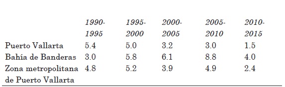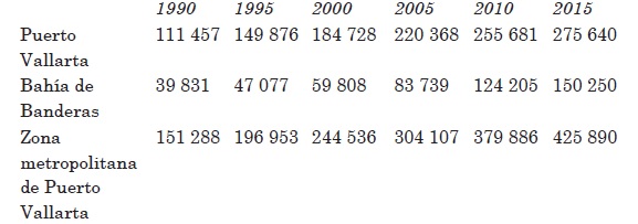 Hoy día, se puede enfatizar que la zona metropolitana en estudio se caracteriza por un alto crecimiento demográfico. Para ejemplificar: en el año de 2015, su tasa de crecimiento demográfico fue del 2.4%. El crecimiento demográfico más alto se registró en la periferia, es decir, en el municipio de Bahía de Banderas, cuya tasa fue del 4%, mientras que la de Puerto Vallarta, el municipio central que dio origen a la conformación de la zona metropolitana de Puerto Vallarta, fue del 1.5%. En términos absolutos, el crecimiento demográfico de la zona metropolitana se puede observar en la Tabla 3.