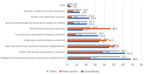 La forma de organización de las parejas se revela en las rutinas que llevan a cabo y, en el caso del período de confinamiento, en la exploración sobre si tales rutinas han cambiado. Llama la atención que el 57.1% de los encuestados informó que colaboran entre ambos para hacer cosas juntos, lo cual expresa un alto índice de compenetración entre ellos, y casi en la misma proporción responden que tienen más tiempo para platicar y convivir (56.1%). Esto se combina con que el 46.8% conserva espacios de actividad independiente, lo cual denota respeto por la individualidad en casi la mitad de los casos. En un sentido opuesto aparece que el propio encuestado (36.8%) y su pareja (31.7%) pasan demasiado tiempo en Internet, trabajan más que antes (21.2%), y discuten más y con mayor frecuencia (15.1%). Estos cambios en las rutinas de pareja, no obstante, difieren en la frecuencia de selección por parte de los encuestados, en función de si viven junto a su pareja o viven separados (gráfica 1).