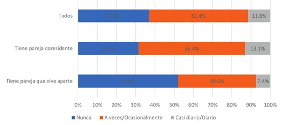 El 51.4% de los respondientes declaró con una frecuencia media/baja (ocasionalmente o algunas veces en la semana) que el teléfono celular ha interferido en la convivencia en pareja durante el confinamiento, mientras que el 11.6% señaló una frecuencia alta/constante (casi diario o diario). En conjunto, seis de cada diez de los encuestados refirió algún nivel de frecuencia para interferencias a causa del teléfono celular. Esta frecuencia, obviamente, es más alta para los encuestados que corresiden con su pareja que para los que viven en casas distintas (55.4% y 40.6% con una frecuencia media/baja y 13.1% y 7.4% con frecuencia alta/ constante respectivamente) (gráfica 10). Los teléfonos móviles tienen este potencial para interferir en las relaciones de pareja y, en realidad, en cualquier otro tipo de relación, por el apego que generan en sus usuarios, por la compulsión a ver notificaciones de mensajes recibidos y por la posibilidad de mantener, de manera relativamente privada, comunicación con otros vínculos afectivos. Se trata de un dispositivo que tanto permite la presencia en la ausencia, como la ausencia en la presencia. La ausencia en la presencia con el uso del celular es causa de molestias en la pareja. Este resultado se refuerza con otro proveniente de una pregunta general sobre las tensiones o conflictos de pareja durante la pandemia, que incorporó la opción de respuesta “Mi pareja pasa mucho tiempo en su celular” entre un conjunto de quince respuestas predefinidas de diversa índole. Los encuestados seleccionaron esta opción como la segunda más importante para crear tensiones y conflictos (29.7%). Esta opción quedó solo debajo de la respuesta más elegida que, fue estrés por el encierro durante la pandemia de la COVID-19 y superó a otros motivos, como la falta de temas de interés comunes, la no colaboración en los quehaceres domésticos, el trabajar en casa y convivir con la familia al mismo tiempo, el cuidado de los hijos, las adicciones, la violencia o la salud, entre otros. Adicionalmente, la opción que quedó en el séptimo de lugar de respuestas más elegidas fue la tensión causada por el tiempo que su pareja pasa en actividades en Internet (redes sociales, chats, etcétera) (gráfica 3).