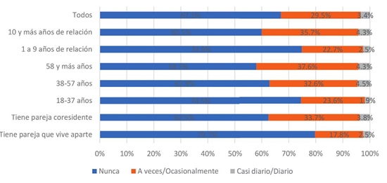 Las tecnologías asociadas a Internet han abierto oportunidades para la gestión de encuentros sexuales con desconocidos (aplicaciones de citas y redes sociales principalmente), o para interactuar sexualmente cuando las parejas están separadas geográficamente (por ejemplo, a través de chats eróticos o videollamadas sexuales). Internet, durante el periodo de la pandemia, ha sido un medio para mantener intimidad sexual a pesar de la distancia. En una pregunta sobre la experiencia de usos más frecuentes de Internet en el que se plantearon catorce respuestas predefinidas, se incorporaron dos respuestas sobre usos sexuales que registraron un porcentaje de selección baja entre los encuestados. Solo el 9.9% de los respondientes seleccionó ver pornografía en Internet, mientras solo el 2.5% eligió tener cibersexo. Estos datos nos permiten afirmar que los usos sexuales de Internet no fueron casi elegidos por la muestra estudiada (en este caso, compitiendo con otras clases de usos más comunes o menos estigmatizados). No obstante, es interesante observar las diferencias por sexo. En el caso de los hombres, el 23.7% seleccionó ver pornografía en Internet, frente al 4.4% de las mujeres. También los jóvenes seleccionaron esta respuesta con mayor frecuencia (14.3) con respecto a los otros grupos de edad (6.5 en adultos medios y 7.5 en adultos mayores). Curiosamente, en lo que corresponde a tener cibersexo, esta respuesta fue seleccionada ligeramente más por mujeres (2.8%) que por hombres (1.9%), pero no es un resultado definitivo.