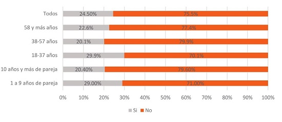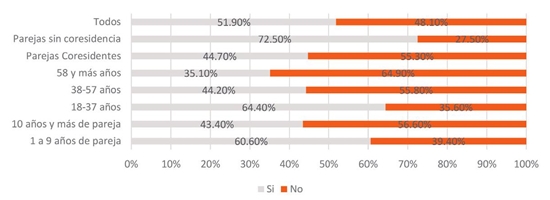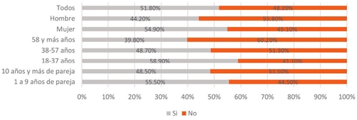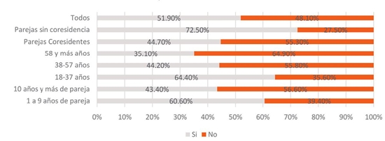 Con la misma intención de explorar los cambios en la vida sexual, se formuló una pregunta directa sobre si han vivido o no cambios en este aspecto, a lo que los encuestados respondieron sí en el 51.9%, y no el 48.1%.20 En esta pregunta, los resultados convergen claramente con los presentados en la gráfica 5: los grupos que informan con más frecuencia que su vida sexual cambió fueron quienes tienen parejas sin corresidencia, los jóvenes adultos y los que tienen relaciones de pareja con menos de diez años de duración.