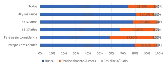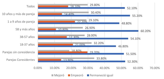 La situación de confinamiento que nos informaron los respondientes es que la mayoría de ellos se ha quedado en casa durante la pandemia (87.6%), mientras que una menor parte ha tenido que salir a su lugar de trabajo (10.9%), seguida de otra parte que ha alternado periodos de quedarse en casa con salidas laborales (1.3%). Con respecto a lo que ocurre con sus parejas, la mayor parte observó que su pareja se ha quedado en casa (70.9%), seguida de la opción de salir a trabajar a su lugar de trabajo (26.3%) y finalmente de la opción de alternar periodos de quedarse en casa con salir a trabajar (2%). Los respondientes de nuestra encuesta informaron que la mayor parte de las parejas compartió la residencia (73.4%), pero un poco más de un cuarto, el 26.6%, no es corresidente. Los retos que implica cada situación fueron distintos. Las parejas corresidentes tuvieron que ajustarse a estar veinticuatro horas al día, siete días de la semana, juntos en una vivienda dentro de la cual tuvieron que definir zonas de espacio compartido y otras de espacio privado, así fueran algunas horas o minutos al día.