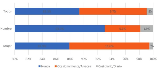 Finalmente, los videojuegos fueron dispositivos que no obtuvieron niveles de frecuencia importantes en cuanto a interferir en la convivencia de pareja: el 82.8% de la muestra estudiada señaló que nunca le ha ocurrido.