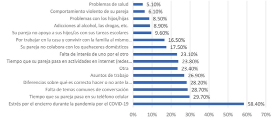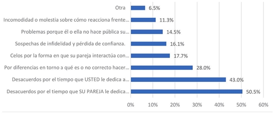 La razón más sobresaliente para haber tenido conflictos fue estrés por el encierro, tensión venida desde fuera de la pareja misma, seleccionada por el 58.4% de los respondientes, seguida de lejos por las opciones del tiempo que su pareja pasa en el celular, falta de temas comunes de conversación, diferencias frente a lo que es correcto hacer o no durante la pandemia, entre otras respuestas con frecuencias menores (gráfica 3). Es evidente que la situación de confinamiento ha marcado su impronta en la dinámica de las parejas de los estratos que predominan en la muestra estudiada, tanto en términos de estrés como de discusiones sobre cuál es el comportamiento más adecuado para enfrentar la pandemia en la vida cotidiana.