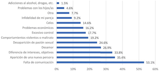 El confinamiento coloca a la pareja frente a un espejo donde se ve desnuda. Sin las actividades fuera de casa, las interacciones en círculos de amistad, laborales y familiares, las parejas se quedan solas, y sus problemas aparecen nítidamente, lo que hace imposible ignorarlos. El motivo más seleccionado entre quienes admitieron haber pensado en el divorcio o separación (n= 177) fue la falta de comunicación, con un 53.1% a la cual podríamos juntar con las diferencias de intereses y objetivos, mencionada por el 33.8%. En este sentido, el conjunto con mayor porcentaje se refiere a parejas que permanecían juntas por inercia, que ya no comparten los elementos fundamentales de la unión, como la comunicación y el proyecto en común. A esto se une un tercer conjunto donde aparece el desamor, en el 26.9%, y la desaparición de la pasión sexual, en el 24.6%, elementos que remiten a la caducidad del sentimiento amoroso y el deseo. Enseguida y a pesar de estar confinados, los encuestados refieren la aparición de una nueva persona en el 35.4%, los celos en el 14.6% y la infidelidad en el 9.2%, asuntos que aluden a la crisis de la pareja por la violación del principio de la monogamia, tan caro al imaginario romántico y amenaza tradicional a las parejas establecidas. Por último, esta convivencia intensificada del confinamiento produce excesivo control para el 17.7%, y comportamientos violentos y maltrato en el 19.2% (gráfica 4).