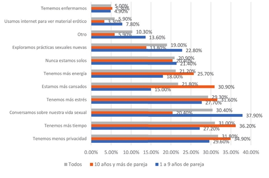De manera específica, podemos observar que, entre quienes respondieron que sí cambió su vida sexual (n=358) en términos negativos, sobresale, en primer lugar, la disminución de la privacidad (31.8%); en segundo, el aumento del estrés (29.3%); en tercero, el mayor cansancio (21.8%), y, en cuarto, nunca estar solos (20.9%). En contraste, los cuatro lugares destacados para las respuestas de cambios positivos fueron: primero, tener más tiempo (31%); segundo, conversar sobre la vida sexual (30.4%), tercero, tener más energía (21.2%) y, cuarto, explorar prácticas sexuales nuevas (19%). Al observar la distinción por sexo, las mujeres destacaron el tener menos privacidad (34.1% vs 25.8% de los hombres) y el no estar solos (23% vs 15.5% de los hombres), frente a los hombres que señalaron en mayor medida tener más energía (28.9% vs 18.4% de las mujeres) y explorar prácticas nuevas (25.8% vs 16.5% de las mujeres). Como vemos, es posible que el que la pareja se encuentre sola y encerrada permite mayores espacios de convivencia y diálogo que para las mujeres proveen mayor disfrute como complemento a la práctica sexual. Observando los datos por duración de años de vida en común, se destaca que los que tienen más de diez años juntos responden tener más energía (25.7% vs 18%), tener más tiempo (36.2% vs 27.2%), y estar más cansados (30.9% vs 15%), mientras que los de menos de diez años juntos conversan más sobre su vida sexual (37.9% vs 20.4%) y exploran prácticas sexuales nuevas (22.8% vs 13.8%). Es evidente que, así como el grupo de jóvenes es el más afectado en su vida sexual, al mismo tiempo es el que más relevancia le otorga concediéndole atención y creatividad (gráfica 7).