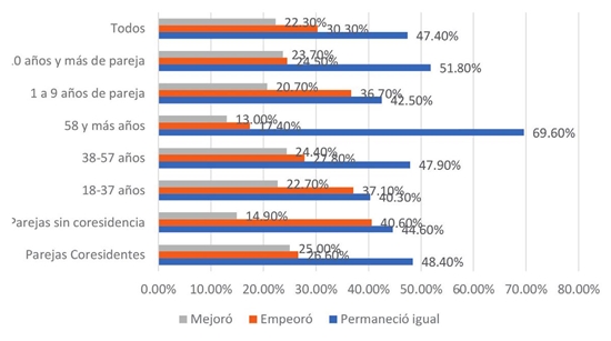Con respecto a la percepción de que durante el confinamiento la vida sexual empeoró, observamos la frecuencia más alta en quienes tienen parejas sin corresidencia, tienen relaciones de menos de diez años y son jóvenes adultos. No encontramos diferencias por sexo. A partir de este primer acercamiento, se dibuja una tendencia clara en nuestros resultados, el grupo de los jóvenes es el que más ha visto afectada su vida sexual, en concordancia con ser ellos quienes tienen menor cantidad de años de vida en común y quienes más están implicados en relaciones sin corresidencia.19