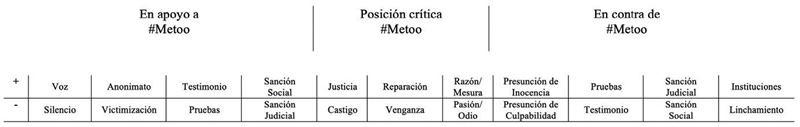 En la figura 1 se pueden apreciar las estructuras binarias de los discursos en competencia que marcaron la disputa por el #Metoo y la muerte de Vega-Gil. Destaca la confrontación respecto al carácter civil o anticivil -sagrado o contaminante- de: la denuncia anónima o abierta; del testimonio frente a la prueba; de la sanción social contra lo legal; la venganza frente a la justicia; de la pasión frente a la razón; de la culpabilidad o la inocencia. Estas relaciones binarias permiten apreciar tres estructuras narrativas del debate y ayudan a comprender el campo de oportunidad y las dificultades que existen para establecer discursos y narrativas que permitan entrelazar las posiciones en competencia.