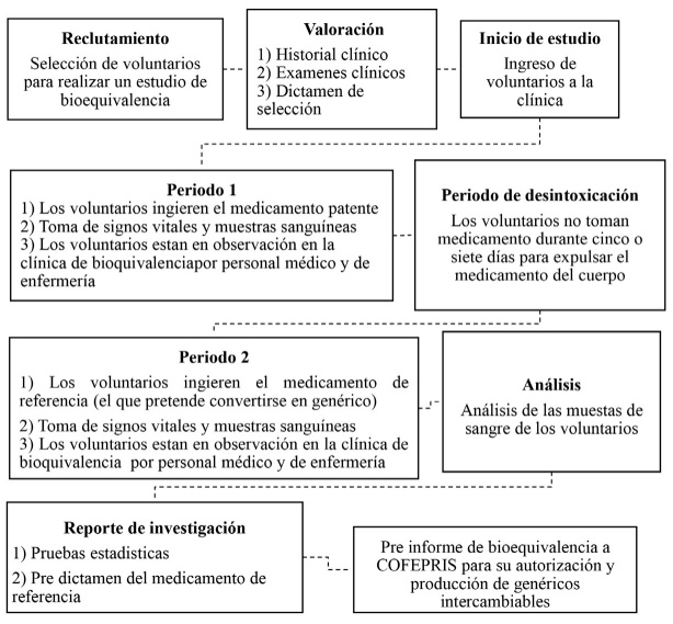 Para realizar los estudios de bioequivalencia los voluntarios pasaban por dos periodos de prueba. Por ejemplo, en la primera etapa (periodo uno), ingerían el fármaco patente y, después de un periodo de cinco a siete días de desintoxicación, tomaban el fármaco de prueba (periodo 2).10 Se hacía de forma periódica para que el tracto gastrointestinal digiriera el medicamento y no afectar el segundo periodo de prueba.