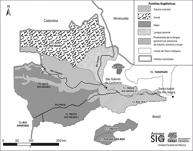 Esta investigación se llevó a cabo en la región del DSEI Alto Rio Negro, que se ubica en el Noroeste amazónico y abarca tierras indígenas en los municipios de São Gabriel da Cachoeira, Barcelos y Santa Isabel do Rio Negro. Según datos del Sistema de Información de Atención a la Salud Indígena (SIASI, 2013), en esa región viven cerca de 36 390 personas, identificadas como pertenecientes a 45 etnias. Las principales son, de mayor cantidad poblacional a menor, baré, baniwa, tukano, hupde, tariano, desano, curipako, piratapuia y warekena. La región se divide en términos geopolíticos por los principales cursos de los ríos y sus afluentes (véase el Mapa 1). Este territorio posee una importante diversidad sociocultural y lingüística.