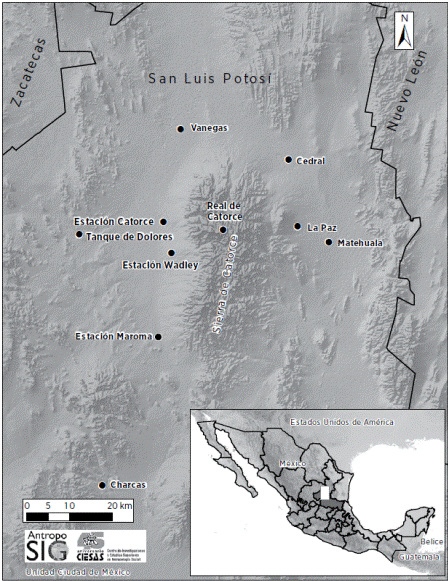 La región de la Sierra de Catorce se localiza al Sureste del Desierto Chihuahuense, en el Norte del estado de San Luis Potosí, próxima a Zacatecas y Nuevo León (véase el mapa 1). Es un pequeño subconjunto de montañas, de unos 40 km de longitud por 35 km de anchura. Algunas de sus cumbres superan los 3 000 msnm (Giménez y González, 2011). Es un importante reducto de flora y fauna amenazada, así como una zona rica en minerales metálicos y no metálicos. El subsuelo alberga depósitos de oro, plata, cobre, plomo, zinc, hierro, antimonio y mercurio.