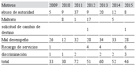 Los motivos de las denuncias eran, según datos de la GNA, abuso de autoridad, maltrato a los subalternos, solicitud de cambio de destino, mal desempeño, recargo de servicios y discriminación (véase el cuadro 1). Las denuncias se incrementaron, alcanzaron su pico en 2011 y luego empezaron a descender. La mayor proporción fue hecha por personal del Operativo Centinela y del OCS en el AMBA.
