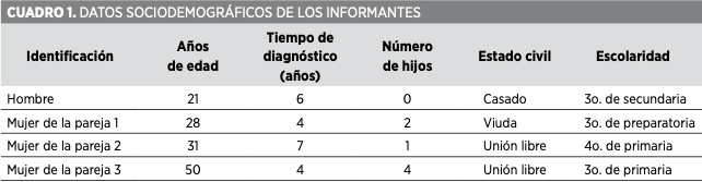 Este artículo se basa en una entrevista del subgrupo de hombres heterosexuales y tres de mujeres, que tenían información personal relacionada con al menos una experiencia de embarazo, reflexionada o llevada a cabo, una vez que tuvieron el diagnóstico. Los datos sociodemográficos se presentan en el cuadro 1.