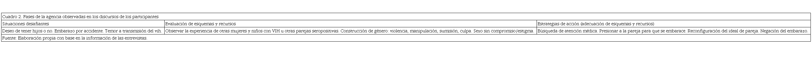 La agencia está presente en todas las PV que participaron. Enfrentan situaciones que desafían su imaginación, como embarazo por accidente en una relación sexual, presión de la pareja para tener sexo sin condón o para embarazarse; evalúan los recursos y esquemas disponibles en su medio ambiente estructural, y elaboran estrategias que responden a cada desafío.