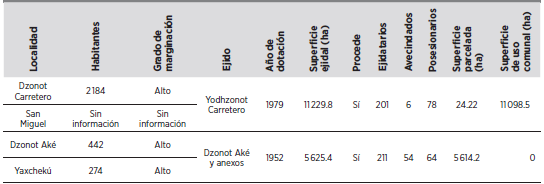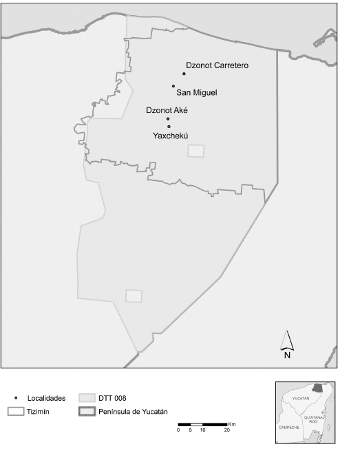 La investigación se desarrolló en cuatro localidades vecinas del municipio de Tizimín (véase el mapa 1). Dzonot Carretero y San Miguel pertenecen al ejido de Dzonot Carretero, y Dzonot Aké y Yaxchekú corresponden al de Dzonot Aké. Los dos ejidos se crearon en distintos momentos de la Reforma Agraria en la región; Dzonot Aké a mediados del siglo xx y Dzonot Carretero en la etapa más tardía, a finales de la década de 1970. En fechas recientes, en los dos ejidos se ejecutó el Programa de Certificación de Derechos Ejidales y Titulación de Solares (Procede), instrumentado en la década de 1990 para regularizar la propiedad ejidal. El Procede dio resultados diferentes en cada ejido. Los ejidatarios de Dzonot Carretero optaron por mantener la mayor parte de sus tierras como propiedad comunal, mientras los de Dzonot Aké se inclinaron por la parcelación. Ambos cuentan con un número elevado de avecindados y posesionarios que pueden hacer uso de las tierras ejidales. Este factor es importante pues en las localidades de estudio algunos de los productores que hoy utilizan el riego carecen de parcelas propias y tienen acceso a la tierra ejidal mediante compra o renta, lo que traza condiciones peculiares en su uso del riego.2 Por otra parte, las localidades de estudio tienen muy baja densidad de población y han sido clasificadas como de alta marginación (véase el cuadro 1).