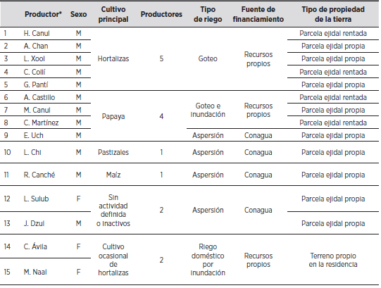 Los agricultores mayas que entrevistamos se ajustan a las características descritas en los incisos c y d (véase el cuadro 2), y utilizan los sistemas de riego por goteo, aspersión o inundación al mismo tiempo o por separado, en el cultivo de hortalizas variadas, chile habanero, papaya o pastizales.
