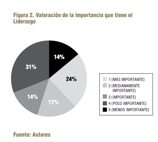 La figura 2 da cuenta de la evaluación del liderazgo, dando como resultado que el 31% de los entrevistados la consideró como poco importante, mientras que el 24% la califica como más importante, el 17% la evaluó como medianamente importante