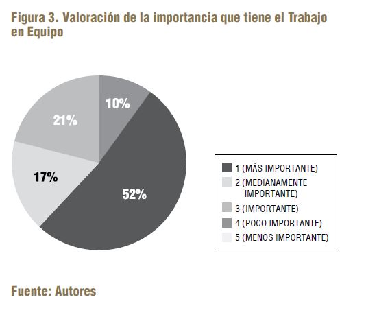 En la figura 3 se evidencia que el 52% de los entrevistados consideran la competencia trabajo en equipo como una de las más importantes, por otra parte, un 21% opina que es importante, mientras que el 17% considera que es medianamente importante.