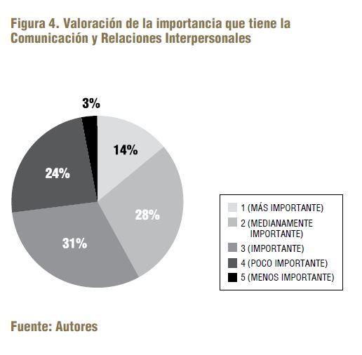 La competencia Comunicación y Relaciones Interpersonales, exhibida en la figura 4 es evaluada como importante por el 31% de los entrevistados, el 28% la considera medianamente importante y el 24% piensa que es poco importante.