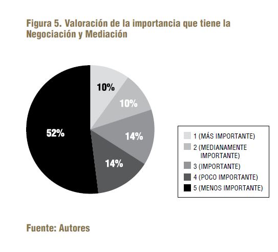 La figura 5 pone de manifiesto que con respecto a la competencia Negociación y Mediación un 52% de los entrevistados la percibe como menos importante, mientras que las respuestas poco importan- te e importante tienen el 14% del porcentaje total.