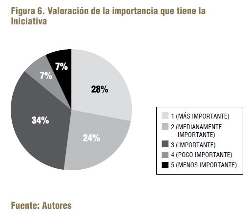 La distribución de la percepción que los empleadores tienen acerca de la competencia Iniciativa se evidencia en la figura 6, se muestra que un 34% de estos la considera importante, por otra parte, el 28% la considera más importante y el 24% opina que es medianamente importante.