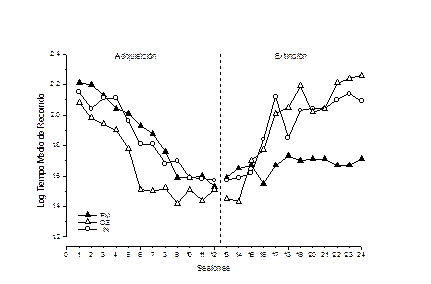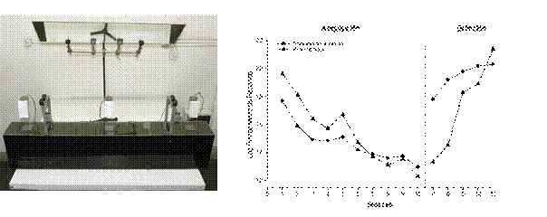La utilización efectiva del agua como estímulo apetitivo en anfibios fue sistemáticamente desarrollada en procedimientos de condicionamiento operante en nuestro laboratorio. Uno de los primeros estudios realizados incluyó el análisis del aprendizaje en una situación de corredor recto, usando sapos de la especie Rhinella arenarum parcialmente deshidratados y agua como recompensa (Muzio, Segura & Papini, 1992). En dicho estudio, los sujetos mostraron distintas habilidades relacionadas con el aprendizaje asociativo, tales como la adquisición, la extinción, la recuperación instantánea de la respuesta de recorrido y el efecto subsiguiente al reforzador (ver Figuras 1 y 2).