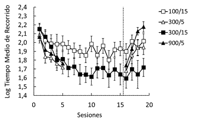Otro aspecto interesante derivado del uso del agua como estímulo apetitivo en anfibios, surge de analizar el balance entre la magnitud de la recompensa y el tiempo de reforzamiento. En un trabajo reciente, Puddington, Papini y Muzio (2018a) realizaron un experimento para discriminar los factores que afectaban la extinción de una conducta aprendida en sapos, utilizando un diseño factorial en aras de evaluar por separado el efecto de la magnitud de recompensa total en la adquisición y la duración de los ensayos de extinción. En un primer experimento, se varió la magnitud de recompensa (900, 300 o 100 segundos de acceso a agua por sesión) y la cantidad de entrenamiento de adquisición (5 o 15 sesiones). En cada grupo de animales, la duración de las sesiones de extinción fue la misma que durante las sesiones de adquisición. Los resultados obtenidos (Figura 4) muestran que con la cantidad total de acceso al agua equiparada en la adquisición, la extinción fue más rápida en animales que habían recibido recompensas más grandes (latencias mayores en el grupo 900/5 que en el grupo 300/15); pero con la cantidad total de entrenamiento igualada, la extinción fue más rápida en los animales que recibieron recompensas más pequeñas (latencias mayores en el grupo 100/15 que en el 300/15).