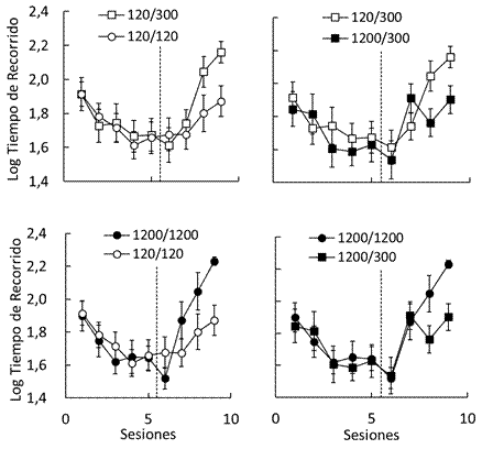 En otras palabras, teniendo igualada en la adquisición la cantidad total de acceso al agua entre grupos, con recompensas menores por sesión, pero distribuidas a lo largo de un mayor número de sesiones, se obtiene una menor extinción con respecto a grandes recompensas por sesión, pero distribuidas a lo largo de un menor número de sesiones (en nuestro ejemplo, Grupo 300/15 vs. Grupo 900/5). En un segundo experimento, Puddington, Papini & Muzio (2018a) variaron la magnitud de la recompensa (1200 o 120 segundos de acceso a agua por sesión) mientras se mantenían constantes el número de sesiones de adquisición (5 sesiones) y la duración de las sesiones de extinción (300 segundos); en este caso, los resultados (Figura 5) muestran que el desempeño de extinción fue menor con una magnitud de recompensa pequeña que con una recompensa grande (latencias más largas en 120/300 que en 1200/300).