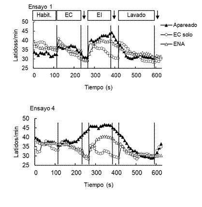En un primer estudio, Daneri, Papini & Muzio (2007) caracterizaron una respuesta de escape y evitación activa. Para ello se explotó la capacidad de los sapos para detectar la concentración de varias soluciones salinas, utilizando una solución neutra (300 mM de NaCl) como señal anticipatoria de una solución aversiva (800 mM de NaCl, altamente hipertónica). En primer lugar, utilizando esta capacidad se desarrolló un procedimiento en una situación inescapable donde se observó un condicionamiento aversivo del ritmo cardíaco (Figura 6).