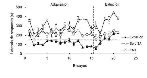 En esta situación se entrenaron dos grupos de sapos (experimental y control) que aprendieron a moverse del compartimento iluminado al compartimento oscuro. Una vez que los animales respondían, los que pertenecían al grupo experimental eran expuestos a una solución de NaCl altamente hipertónica de 800 mM (lo cual lleva a una pérdida de peso). En cambio, los animales del grupo control recibieron exposición a una solución de NaCl levemente hipertónica de 300 mM (que no genera ganancia ni pérdida de peso). Después de 10 ensayos de adquisición, los animales en el grupo experimental mostraron una latencia significativamente mayor para ingresar al compartimento oscuro respecto de los animales del grupo control (Figura 8B). De esta forma, los animales experimentales mostraron una adquisición gradual de la respuesta de evitación pasiva, mientras que los animales del grupo control mantenían su latencia de respuesta estable a lo largo de los ensayos.