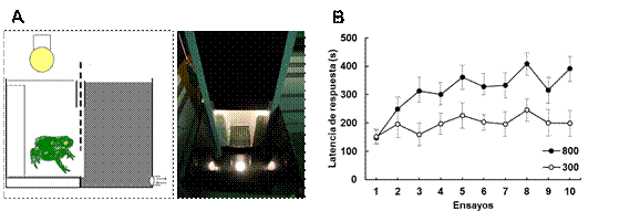 Posteriormente, Puddington, Daneri, Papini y Muzio (2016), empleando las propiedades de estas mismas soluciones salinas en anfibios, extendieron el protocolo de entrenamiento anterior a una situación de evitación pasiva, procedimiento que requiere que los animales aprendan a suprimir una respuesta dominante después de aparearla con un estímulo aversivo. En este caso, se utilizó una caja de salto con dos compartimientos (Figura 8A): uno de partida (iluminado, seco y más pequeño) y otro que contenía la solución salina correspondiente (oscuro). En cada ensayo, los sapos eran colocados en el compartimiento iluminado y se contabilizaba el tiempo que los animales tardaban en cruzar al compartimiento oscuro.