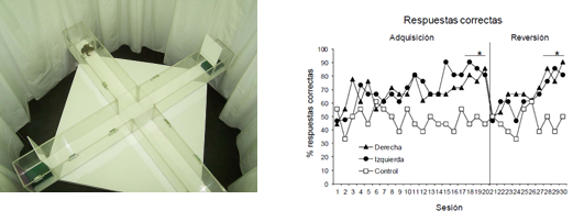 En nuestro laboratorio, usando el sapo terrestre Rhinella arenarum se ha observado que los sujetos son capaces de aprender una tarea de orientación en un laberinto en cruz (con un arreglo espacial en T) empleando agua como recompensa, a la cual se accedía ejecutando siempre la misma respuesta de giro (a la derecha o a la izquierda, según el grupo experimental) (Daneri, Casanave & Muzio, 2011). Una vez alcanzado el criterio de aprendizaje (más del 75% de respuestas correctas) los animales eran capaces de revertir esa respuesta y aplicar la regla a la situación inversa, cuando se cambiaba el sentido de giro para llegar a la recompensa en el brazo opuesto (ver Figura 1).