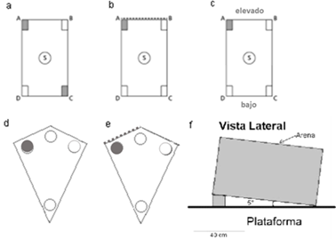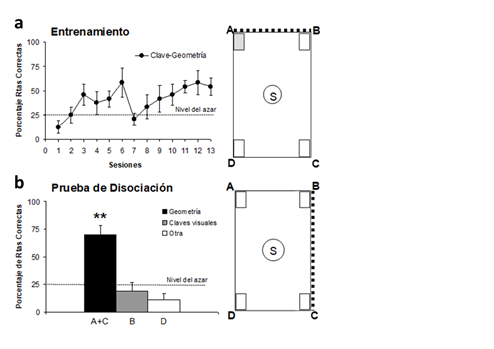 Una vez adquirida la respuesta se realizaron ensayos de prueba (tests): (i) para el grupo Sólo Geometría, el test de Geometría-Invalidada consistía en romper la geometría rectangular colocando en la arena dos paneles adicionales que generaban una nueva geometría cuadrada, la cual no aportaba información precisa sobre la localización de la recompensa; (ii) para el grupo Clave-Geometría se realizaron tres tests: a) Test de Geometría, en el que se retiraba el panel visual, quedando sólo la información aportada por la geometría rectangular para localizar la recompensa; b) Test de Clave, en el que la arena rectangular se transformó en arena cuadrada (ídem grupo Sólo Geometría), sin eliminar el panel rayado; y c) un Test de Disociación/Conflicto, en el que se retiraba el panel de la pared corta y se colocaba un nuevo panel rayado similar en una de las paredes anchas de la arena (Figura 2b derecha). El objetivo de estos últimos tests era establecer si los animales eran capaces de encontrar la recompensa utilizando información geométrica (únicamente), información de clave (únicamente) o información preferencial, ya sea de geometría o clave visual, en el caso de presentarse las fuentes de información en conflicto (determinando así cuál era la preferencia de los animales en esta situación).