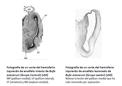 En los anfibios existe la hipótesis aceptada, indicando que el pallium medial es homólogo a la formación hipocampal de otros tetrápodos, basado en la posición topográfica (cuadrante dorsomedial del telencéfalo), sus interconexiones neurales y en la información inmunoneurohistoquímica (ver por ejemplo, Northcutt & Ronan, 1992). Para determinar el papel del pallium medial en el aprendizaje de tareas de orientación y navegación espacial se han realizado en nuestro laboratorio varios experimentos, aplicando tanto procedimientos de lesión como de medición de la actividad neural en esta área (Daneri, Casanave & Muzio, 2015; Sotelo, Daneri, Bingman & Muzio, 2016). En primer lugar, se llevó a cabo un estudio en el que se evaluaron los efectos de la lesión del pallium medial (Figura 4).