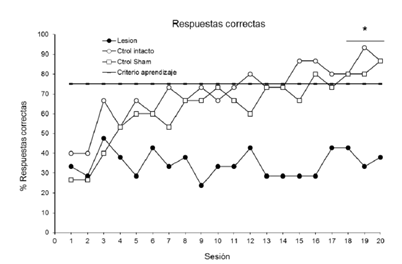 En este caso, la tarea espacial consistió en el aprendizaje de una regla de orientación en un laberinto en cruz, en la que los animales debían ubicar una pileta con agua localizada sólo en uno de los brazos del laberinto (Daneri, Casanave & Muzio, 2011). Los resultados revelaron que los animales lesionados tenían una deficiencia en la adquisición del aprendizaje, ya que no lograron orientarse espacialmente como los animales de los grupos controles (intactos y sham -con operación simulada-). En este caso, su desempeño no mejoró con el entrenamiento y se mantuvo en niveles del azar (Figura 5).