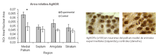 Respecto del análisis de los mecanismos que codifican en anfibios el aprendizaje espacial, en nuestro laboratorio se realizó un estudio entrenando sapos en una arena circular transparente donde los animales tenían acceso a las claves visuales del ambiente y también a claves visuales intralaberinto para orientarse y localizar una recompensa (Daneri, Casanave & Muzio, 2015). Luego de alcanzar el criterio de aprendizaje (75% de respuestas correctas) los animales fueron sacrificados y se evaluó posteriormente la actividad neural de distintas áreas cerebrales empleando la técnica de AgNOR. Los resultados mostraron que hubo una activación diferencial del pallium medial, ya que el área relativa de los NORs era significativamente mayor que en otras áreas cerebrales (Figura 6).
