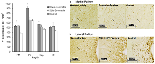 En la Figura 7 también se puede observar un aumento de neuronas marcadas con c-Fos en el pallium lateral, pero sólo en los animales entrenados con geometría y claves visuales (probablemente asociado al procesamiento visual de esta región, aunque serán necesarios más estudios futuros para confirmar esta hipótesis). Las otras dos regiones analizadas (septum y striatum) no mostraron diferencias entre los grupos.