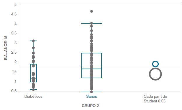 Al comparar el grupo de personas sanas y diabéticas se puede notar que las personas sanas presentan un mejor balance emocional (media= 1.94, d.e.= 0.86) mientras que las personas diabéticas presentan una tendencia muy marcada a un desbalance emocional (media= 1.44, d.e.=0.14) probablemente asociado a su padecimiento, las diferencias entre los grupos fueron significativas (t= 3.165, g.l.=168, p=0.0018*), como se aprecia en la figura 1. Una tendencia similar en la misma dirección y también significativa se encontró para el afecto positivo. La media de afecto positivo para el grupo de diabéticos fue menor que para el grupo de sanos (diabéticos: media= 2.98, d.e.= 0.13; sanos media= 3.27, d.e. =0.06), siendo significativa la diferencia entre grupos (t=1.98, p=0.048*).