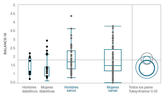 Cuando se desagregaron los dos grupos por sexo, comparación que se muestra en la figura 2, se observa que las mujeres diabéticas difieren significativamente de los hombres sanos, éstos últimos con índices elevados de balance emocional. Esas diferencias fueron significativas empleando la prueba no paramétrica de Tukey-Kramer.
