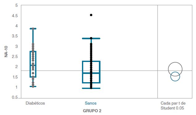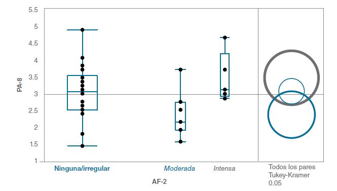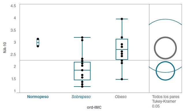 Para el análisis se empleó el paquete estadístico JMP que permitió realizar las comparaciones entre grupos. Las figuras que se seleccionaron se basan en la representación de los grupos a través de diagramas de caja que permiten apreciar la distribución de las variables estudiadas. En la parte derecha de las figuras se representan mediante distancias entre círculos, las diferencias significativas entre grupos. La distancia entre los círculos, es proporcional a la diferencia estadística entre ellos. Círculos de diferente color son indicativos de diferencias significativas entre los grupos que son comparados.