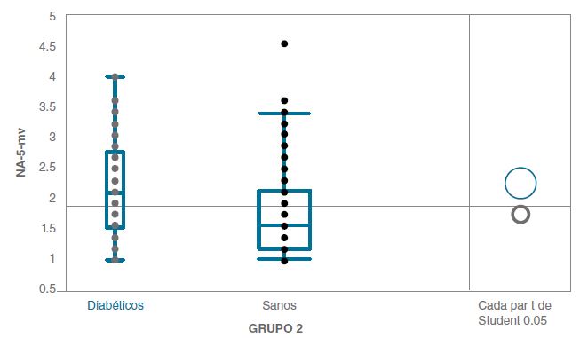 No se encontraron diferencias estadísticamente significativas entre diabéticos y sanos para la subescala de afecto negativo ira y disgusto. Las medias respectivas para esa variable fueron en ese orden de: 2.26 con d.e.= 0.14 y media=2.11 con d.e.= 0.07 (t= -0.95, g.l.= 168, p=0.339).