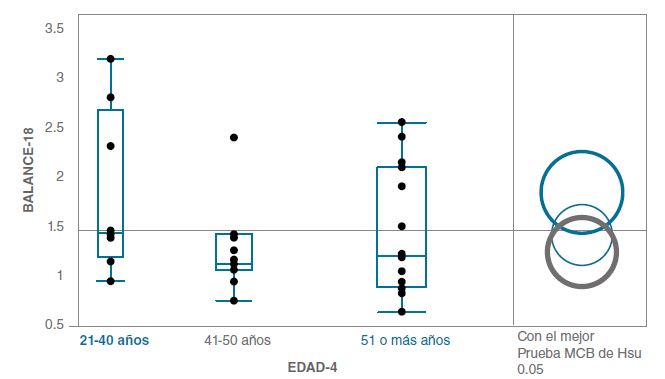 Los valores de balance emocional para los tres grupos fueron como sigue: a) Grupo 1, con edades entre 21 y 40 años, N=8, media=1.81, d.e. = 0.81; b) Grupo 2, edades entre 41-50 años, N=11, media= 1.23, d.e.= 0.18 y c) Grupo 3, edades iguales o superiores a 51 años, N= 15, media= 1.40, d.e.= 0.16. La diferencia estadística entre grupos fue significativa (prueba MCB de Hsu, p≤ 0.05).