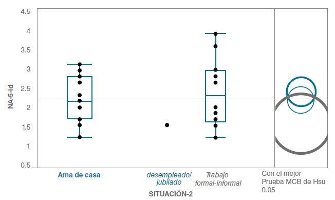 Los valores de afecto negativo en la subescala de ira y disgusto fueron: a) amas de casa media= 2.22, con d.e.= 0.77; b) jubilados o desempleados media=1.4, con d.e.=.003 y c) trabajadores con media=2.5, d.e.=1.04. Las diferencias estadísticas entre grupos fueron significativas de acuerdo a la prueba MCB de Hsu (p≤ 0.05).