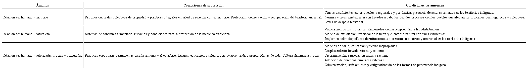 En el Cuadro 2 se presentan los tres ámbitos de relacionamiento del ser humano descritos por la SISPI ( Subcomisión Nacional de Salud Propia e Intercultural de la Mesa Permanente de Concertación con los Pueblos Indígenas y Organizaciones Indígenas, 1996), señalándose las condiciones de protección y amenaza para los pueblos indígenas en Colombia. A partir de esta descripción, resulta evidente cómo tanto la consecuencia del desplazamiento forzado interno, como las condiciones estructurales en el territorio de origen que lo determinan, tales como la presencia de actores armados, la normalización legal de los despojos de tierras, y las políticas económicas extractivistas, se constituyen en condiciones de amenaza para el bienestar indígena