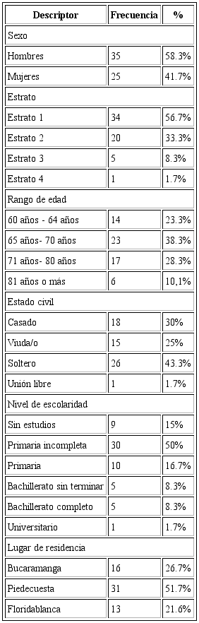 En cuanto a las características sociodemográficas de los participantes, la muestra estuvo conformada en un 58,3% por hombres y un 41,7% por mujeres con una edad entre los 65-70 años (38,3%), 71-80 años (28,3%), 60-64 años (23,3%) y de 81 años en adelante. El 56,7% con estrato socioeconómico 1 y el 33,3% con estrato socioeconómico 2, evidenciando que solo el 10% hacen parte de los estratos 3 y 4. Presentan un nivel de escolaridad de primaria incompleta (50%) y primaria completa (16.7%), por lo demás, el 15% sin estudios, el 8.3% bachillerato completo y bachillerato sin terminar y el 1.7% con título universitario. Finalmente, cabe recalcar que son residentes de los municipios de Piedecuesta (51.7 %), Bucaramanga (26.7%) y Floridablanca (21.6%).