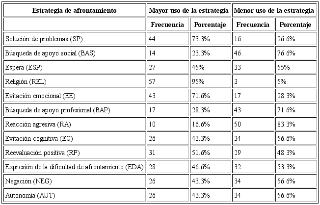 Como se puede apreciar en la tabla 2 las estrategias de mayor uso fueron la religión (95%), solución de problemas (73.3%), evitación emocional (71.6%), y reevaluación positiva (51.6%). Respecto a las de menor uso se identificaron la reacción agresiva (83.3%), búsqueda de apoyo social (76.6%), búsqueda de apoyo profesional (71.6%), evitación cognitiva (56.6%), negación (56.6%), autonomía (56.6%), espera (55%) y expresión de la dificultad de afrontamiento (53.3%).