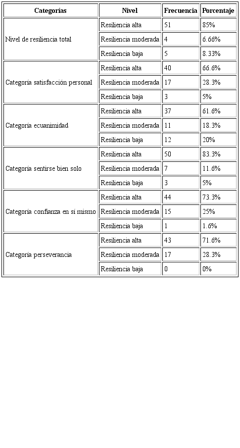 Con relación a la tabla 3 el 85% presenta nivel de resiliencia alto; en cuanto a las sub-escalas “sentirse bien solo” (83.3%), “confianza en sí mismo” (73.3%) y “perseverancia” (71.6%), estas presentan mayor prevalencia, siendo válido mencionar que “satisfacción personal” (66.6%) y “ecuanimidad” (61.6%) muestran una prevalencia destacable.